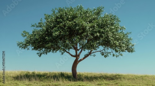 Fototapeta premium Lone deciduous tree with vibrant green foliage under a clear blue sky on a...