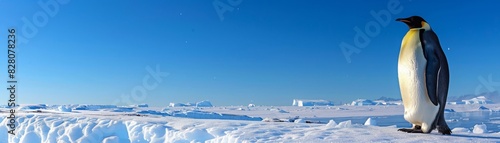 Fototapeta premium Lone emperor penguin standing on ice-covered landscape under clear blue sky,...