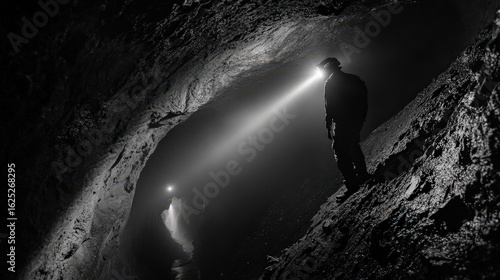 © Pichkan, Fototapeta premium Lone Figure Clad in Headlamp Navigates Dark Labyrinthine Pathway