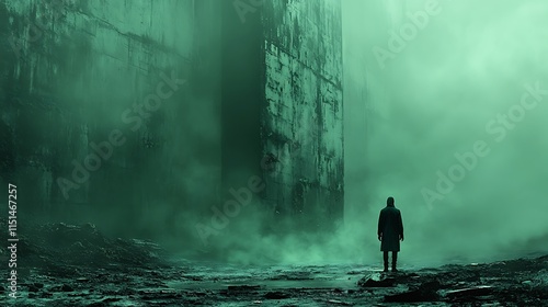 Obraz premium Lone Figure Stands Before Immense Green Foggy Structure