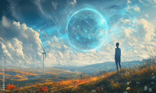 © Kim, Fototapeta premium lone figure stands in awe, gazing up at glowing orb in sky, surrounded by wind turbines and rolling hills