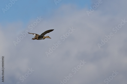 Obraz premium Lone Gadwall Flying Above the Clouds