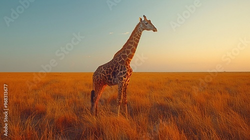 © วรวิทย์ ทรงพลยศ, Obraz premium Lone Giraffe Standing Majestically in the Open Landscape at Sunset