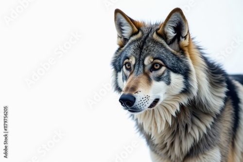 Fototapeta premium Lone gray wolf, intense stare, white backdrop, canine, beast
