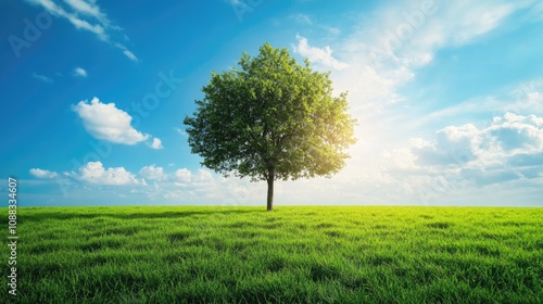 Fototapeta premium Lone green tree standing in a vibrant green field beneath a bright blue sky dotted with fluffy white clouds and warm sunlight.