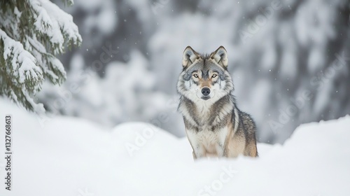 © Auon, Fototapeta premium Lone grey wolf staring into the camera in a snowy forest its breath visible in the freezing air