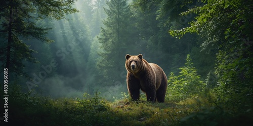 © The 2R Artificiality, Obraz premium Lone grey wolf with dramatic lighting in Quebec forest, emphasizing predator focus