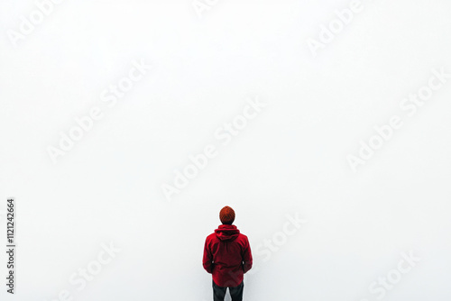 Fototapeta premium Lone individual in a red jacket standing against a vast white background...