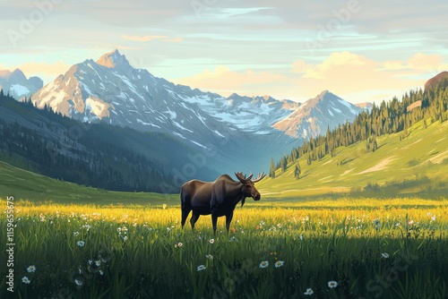 Obraz premium Lone moose at dawn in scenic alpine meadow
