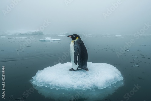 Fototapeta premium Lone Penguin on Melting Ice Patch Facing Uncertain Future in Cloudy Arctic...