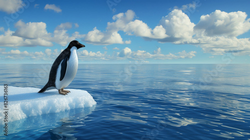 Fototapeta premium Lone penguin perched on an iceberg with a serene blue sea and sky in the...