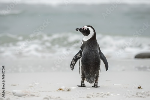 Fototapeta premium Lone penguin standing on a sandy beach. Wildlife in natural habitat....