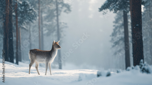 Fototapeta premium lone reindeer stands gracefully in serene winter forest embodying essence of minimalist christmas celebration in