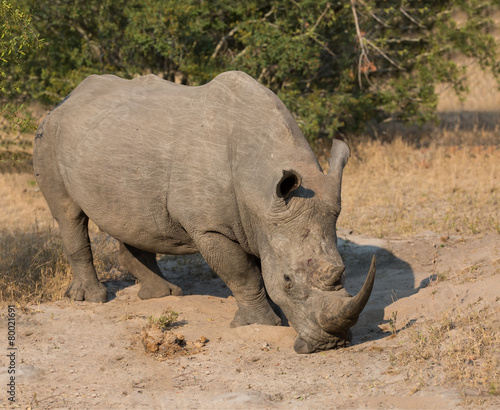© Alta Oosthuizen, Obraz premium Lone rhino standing on open area looking for safety from poacher