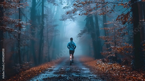 Fototapeta premium Lone Runner Pushing Through Misty Forest at Dawn with Determination