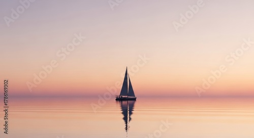 © Yohanessoekamti, Fototapeta premium Lone Sailboat on Calm Water at Serene Sunset with Beautiful Reflection