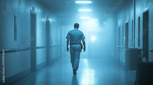 © Gadis, Obraz premium Lone security guard walking down a dimly lit, foggy hospital corridor.