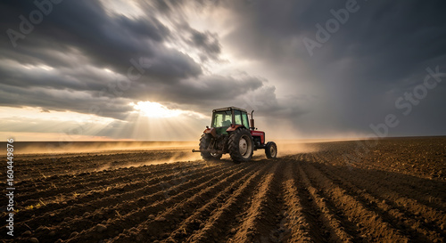 © PrismatikAi, Obraz premium Lone Tractor on Stormy Furrowed Farmland at Twilight