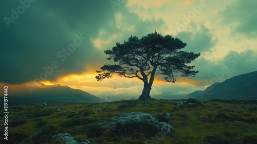 © ShutterBG, Obraz premium Lone tree against a breathtaking sunset with vibrant sky and looming clouds.