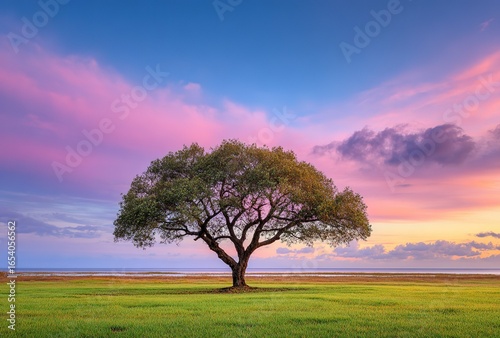Obraz premium Lone Tree at Sunset (Seascape, Colorful Sky, Natural Scene)