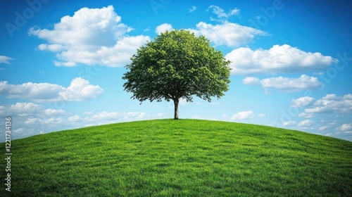 © NAIMAH, Obraz premium Lone tree atop green hill, blue sky, clouds, nature serenity, eco poster