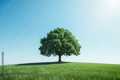 Fototapeta premium Lone tree, green field, clear sky, idyllic landscape, nature
