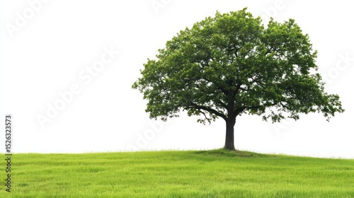 Fototapeta premium Lone tree, green field, white sky, spring, nature, environmental poster