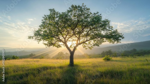 Fototapeta premium Lone tree in a grassy field bathed in golden sunlight during sunrise.