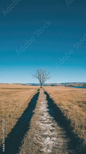 © Ghundutz, Naklejka premium Lone tree in a vast field, path leading to it