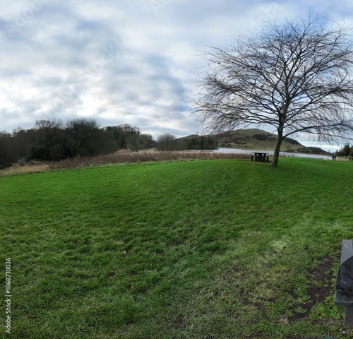 © Larysa, Obraz premium Lone Tree in Green Field Under Cloudy Sky