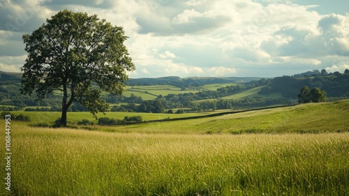 Fototapeta premium Lone tree in green grassy field with rolling hills under cloudy sky
