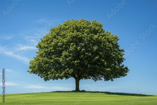 Fototapeta premium Lone tree in lush green with a vibrant blue sky backdrop
