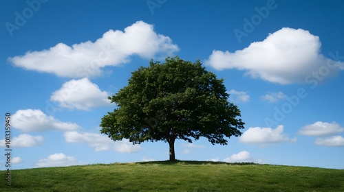 © Aashutosh Pandit, Obraz premium Lone tree on a grassy hill against a blue sky