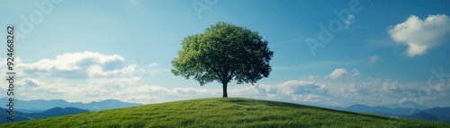 © TPS Studio, Obraz premium Lone Tree on a Green Hill Under a Clear Blue Sky with Rolling Mountains in the Background