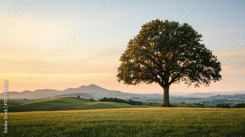 © Tin, Obraz premium Lone tree on grassy field with sunset in the background, serene landscape view.