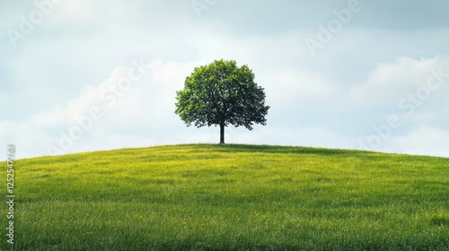 © Zeva, Obraz premium Lone tree on grassy hill, peaceful sky; nature background, serenity