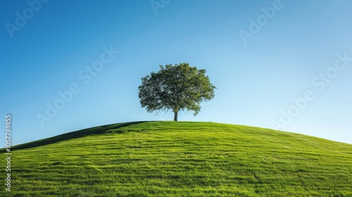 Fototapeta premium Lone tree on rolling green hill under clear blue sky with ample copy space