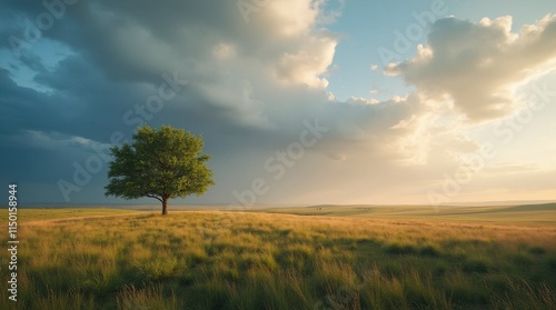 Obraz premium Lone Tree on Wide Open Grassland Under Dramatic Sky