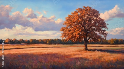 Naklejka premium Lone Tree Standing in a Golden Field at Dusk