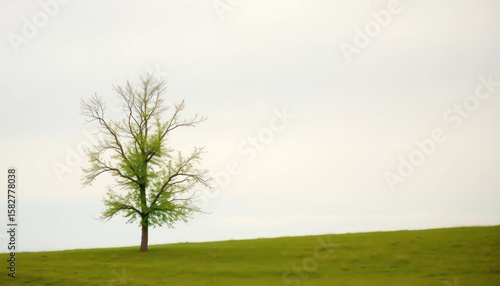 © awan toklo, Obraz premium Lone Tree Standing on a Grassy Hill with a Vast Cloudy Sky Background