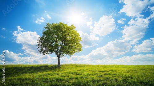 Obraz premium Lone Tree Standing Tall in a Lush Green Meadow Under a Bright Blue Sky with...