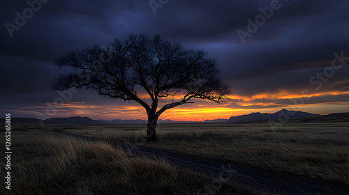 Fototapeta premium Lone tree sunset, plains, dramatic sky, nature scene