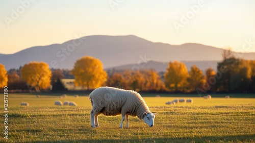 © pngking, Fototapeta premium Lone White Sheep Grazing in Golden Meadow with Mountains and Autumn Trees in Background at Sunset