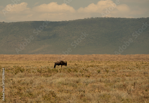 Fototapeta premium Lone wildebeest standing in golden grassland with lush green crater walls in...