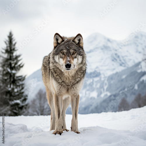 © Miry Haval, Fototapeta premium Lone wolf against a snowy backdrop. AI Generative.