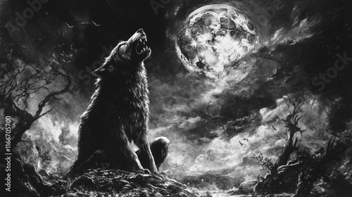 Naklejka premium Lone wolf howling at a large full moon in a dark, stormy night sky.
