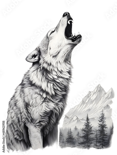 Naklejka premium Lone wolf howling, monochrome art, wildlife call, powerful, isolated on white background