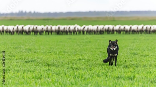 © Oat_Photo, Fototapeta premium Lone Wolf in Green Pasture Sheep Flock Background Wildlife Photography