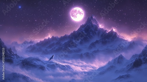 Fototapeta premium Lone wolf on snowy mountain peaks, mystical moonlit night