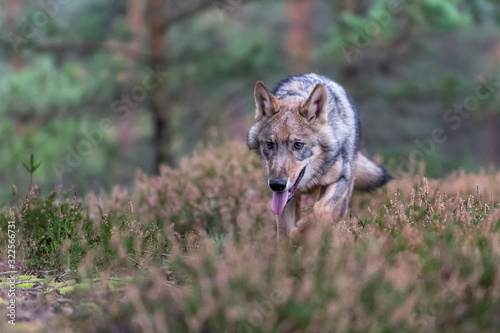 Fototapeta premium Lone wolf running in autumn forest Czech Republic